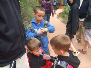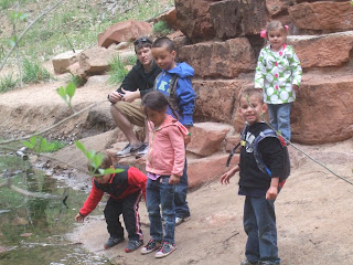 For Spring Break we went with Ben's family to St. George. The first day while the weather was good we did some hiking in Zion. It was beautiful and so much fun. I want to go back. The kids loved riding the shuttle and exploring. Josh especially loved the camelback Jenny let him borrow. Leah did great in the Ergo and fell asleep on one of the hikes. Good times. Too bad the next day it poured and was freezing!