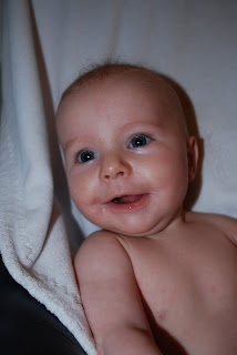 Leah is rolling over from her belly to her back. She gets all smiley about it. My babies try to get big too fast. Slow down Leah :)